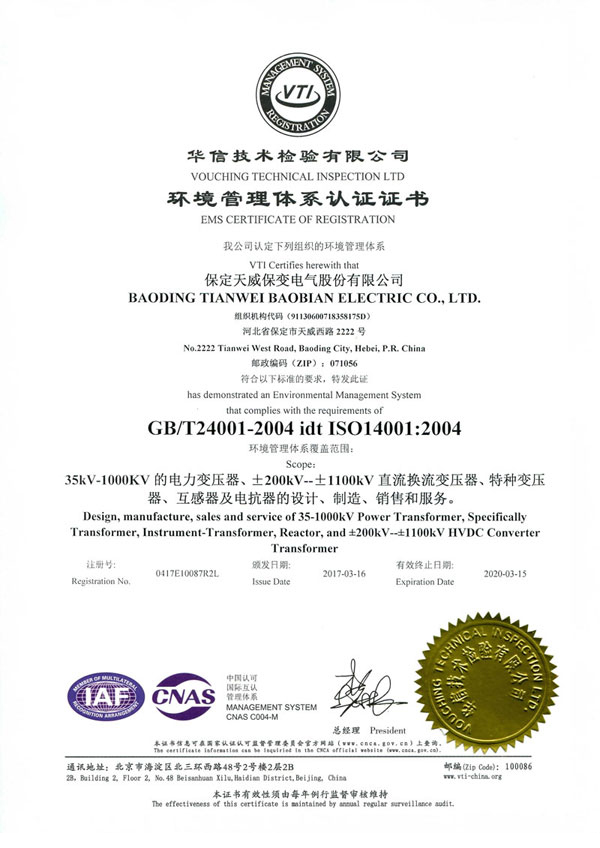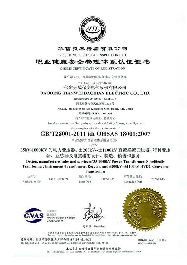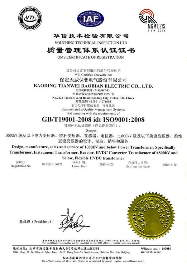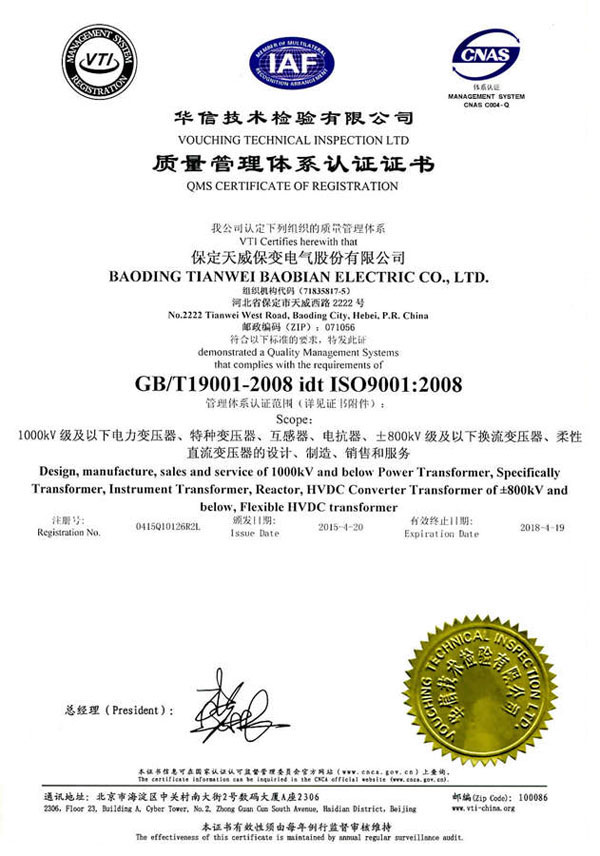 保變電氣公司建立并實施規(guī)范的質(zhì)量管理體系,于1996年取得了ISO 9001:1994質(zhì)量體系認證證書;2003年通過轉(zhuǎn)版實現(xiàn)了ISO9001:2000質(zhì)量管理體系認證。2004年、2007年兩獲河北省質(zhì)量管理獎,2005年獲國家出口免驗證書,通過國家實驗室認證。2006年通過國家產(chǎn)品認證并被中國工業(yè)經(jīng)濟聯(lián)合會評定為中國變壓器、整流器、互感器制造行業(yè)排頭兵企業(yè)。2010年通過了ISO9001:2008轉(zhuǎn)版質(zhì)量管理體系認證。