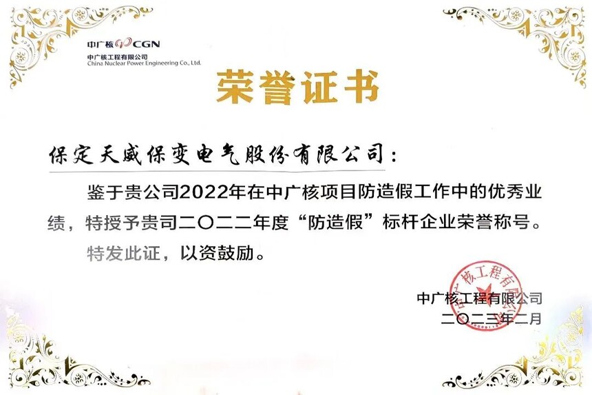 近日,保變電氣喜獲中廣核工程有限公司2022年度防造假標(biāo)桿企業(yè)榮譽(yù)證書(shū)。此次證書(shū)的取得彰顯了核電用戶對(duì)保變電氣在質(zhì)保體系能力、誠(chéng)信經(jīng)營(yíng)、防造假建設(shè)、符合性核查方面的高度認(rèn)可。保變電氣為2022年獲此榮譽(yù)的8家企業(yè)之一,為電氣板塊獲此榮譽(yù)的獨(dú)家企業(yè)。